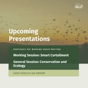 Upcoming Presentations This week, WEST Principal Biologist Rhett Good will be a panelist in a session at the Northeast Bat Working Group (NEBWG) meeting in Harrisburg, PA. Read More ยป January 15, 2025