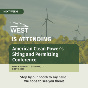 WEST at ACP Siting and Permitting 2026 WEST is excited to attend American Clean Power Association (ACP)‘s Siting and Permitting Conference in Aurora, Colorado, March 30 – April 1, 2026. Our attendance Read More » March 27, 2026