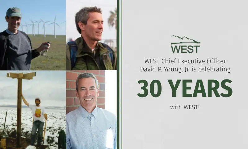 “I would like to congratulate Dave Young on his 30th anniversary at WEST. Dave was the fifth person we hired at WEST and was and remains one of the key figures in our company’s growth. Dave was always forward thinking and interested in developing his skills as a consultant. After starting out as a field supervisor, Dave became one of our top project managers and mentors for younger biologists in the company. Dave expressed an interest in getting trained in the art of habitat conservation planning under the Endangered Species Act and attended USFWS training in the development of HCPs. Following the training, he helped the company develop expertise and significant business in conservation planning for our clients.