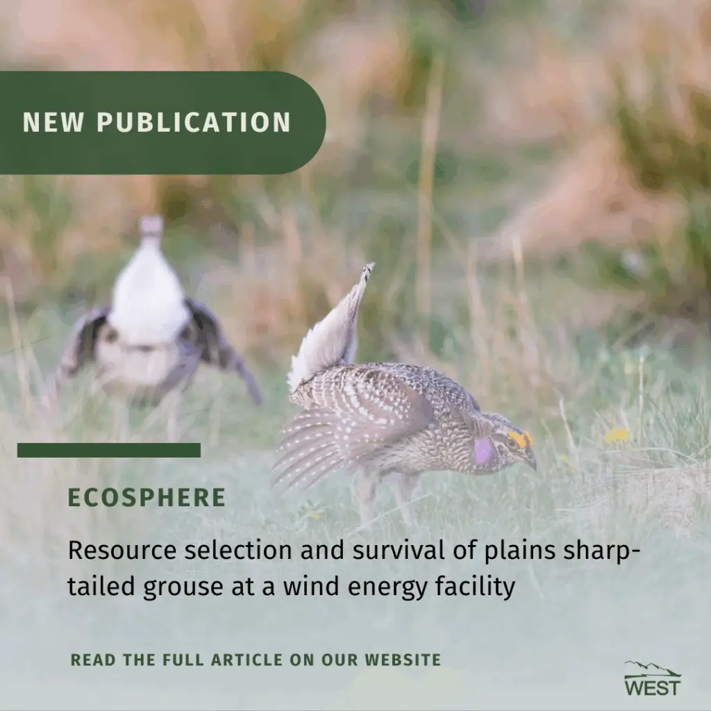WEST Consulting Biologist Carly Kelly is a co-author of the recently published research article, “Resource Selection and Survival of Plains Sharp-tailed Grouse at a Wind Energy Facility,” published in Ecosphere, an Ecological Society of America open access journal. The study examined the impact of wind energy infrastructure on plains sharp-tailed grouse in northeastern South Dakota from 2020 – 2022. Researchers monitored 119 GPS-marked female grouse and found that while nest site selection was not influenced by wind turbines, females with broods and during the breeding season avoided areas with high turbine densities within 1.0 to 5.0 kilometers (km) of their home range. There was no detected effect on nest or female survival. The study suggests that limiting wind turbine siting within 5.0 km of breeding habitats could help minimize habitat avoidance.