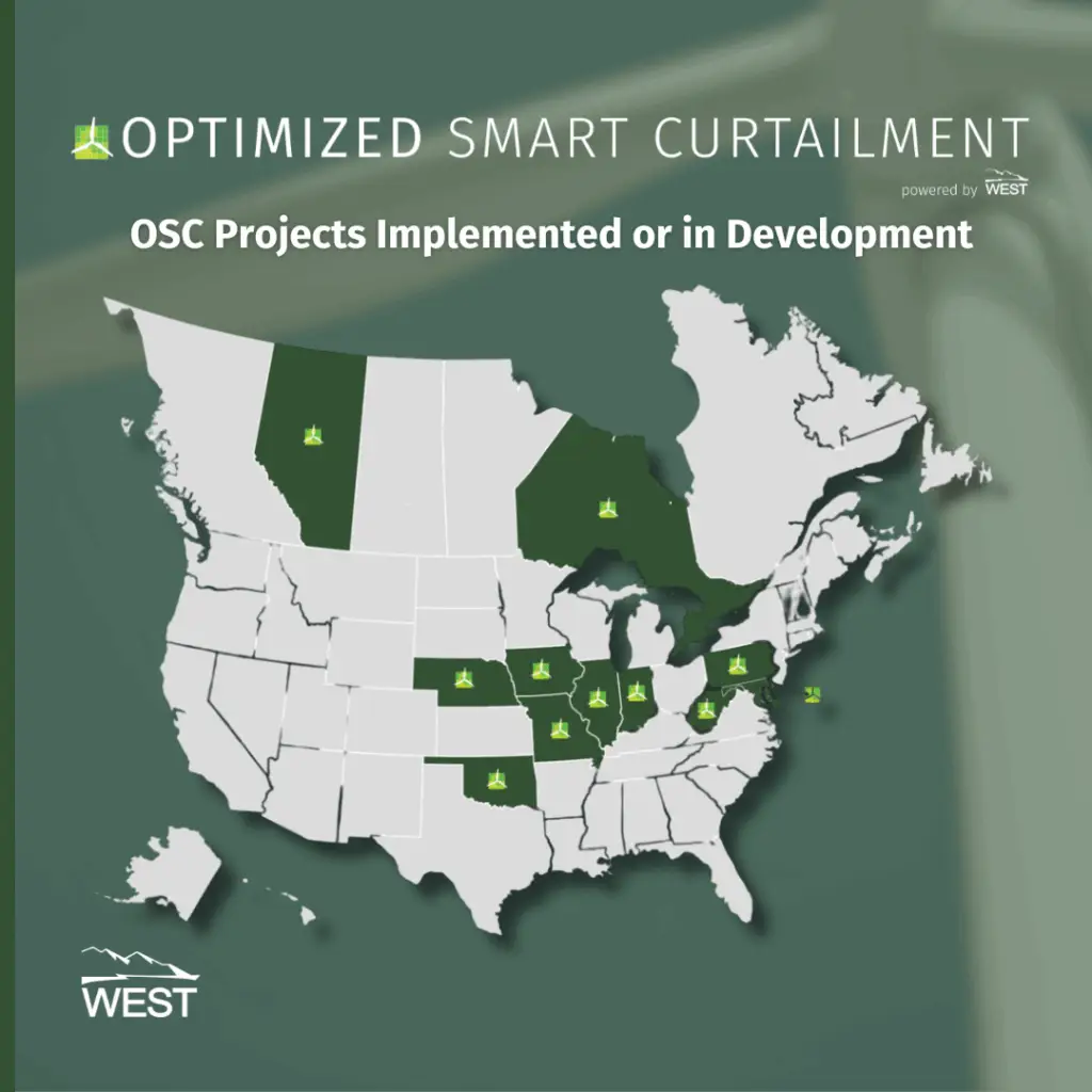 Did you know WEST’s Optimized Smart Curtailment (OSC) solution is being implemented, or is in development, in two Canadian provinces and nine US states? OSC has allowed projects in Alberta and Ontario, Canada, to stay below the bat threshold required to operate in those areas. OSC is also being used in the US to reduce bat fatalities to satisfy permit requirements.