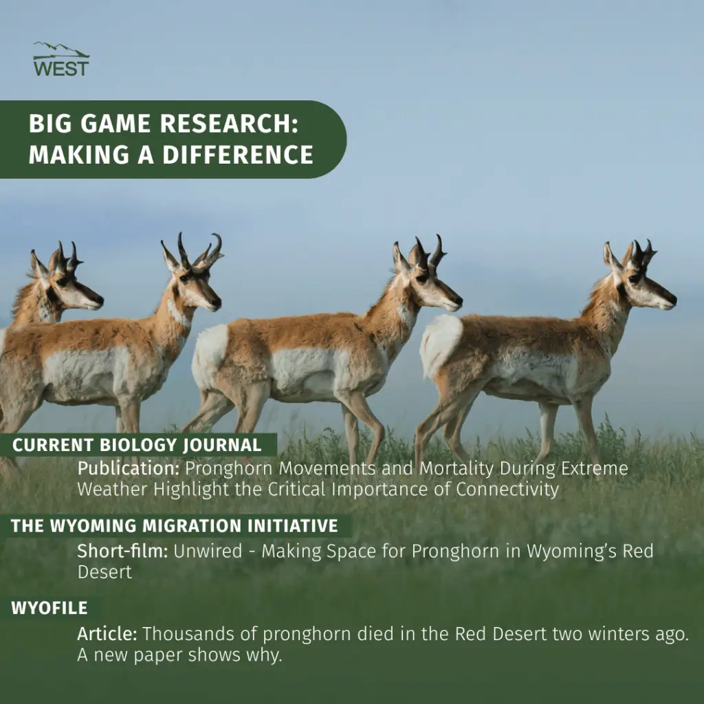 Concurrently, the WEST report led to a collaborative research effort with the University of Wyoming that was published in Current Biology by Cell Press. The article illustrates the importance of connected landscapes and how movement barriers, such as roads and fences, exacerbate pronghorn mortality during severe winters.