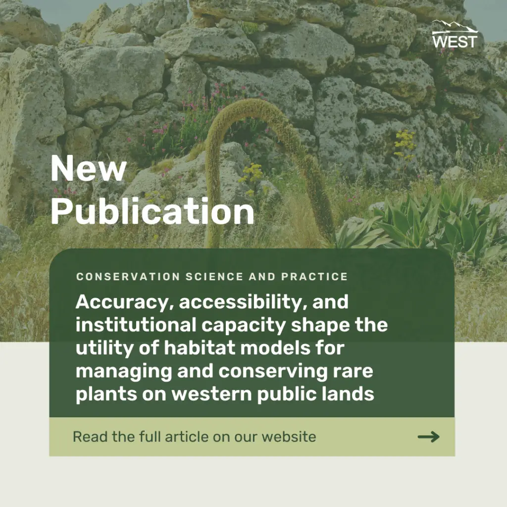 WEST Associate Biologist Lea Selby is a co-author on the recently published research article, “Accuracy, accessibility, and institutional capacity shape the utility of habitat models for managing and conserving rare plants on western public lands”, published in Conservation Science and Practice. Public lands are managed for various uses, including rare plant conservation. The article examines how Bureau of Land Management staff use habitat models. The study found no legal challenges or NEPA document citations of habitat models. Interviews revealed challenges with data organization, model quality, and staffing. Staff suggested improving access to models and developing models for more species to better inform conservation decisions.